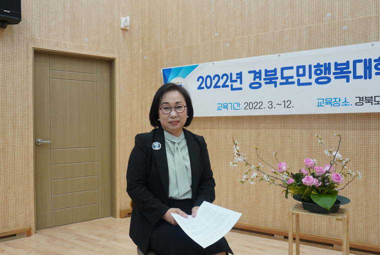 반갑습니다. 원장님 소개를 부탁드립니다. A. 먼저 장시간 이렇게 저희 학교를 방문해주셔서 진심으로 감사드립니다. 저는 경북도민행복대학 명예석사과정 북부권역 캠퍼스 컨소시엄 주임교수이며, 경북도립대학교 평생교육원장 최정숙 교수입니다. 경북도민이면 명예도민석사가 될 수 있다는데, 명예…