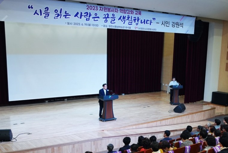 (사)영천시자원봉사센터, 강원석 시인 초청 강연(사)영천시자원봉사센터는 6월 19일 평생학습관 우석홀에서 자원봉사자 및 시민 300여 명이 참여한 가운데 자원봉사자 역량강화교육을 실시했다.이번 교육은 자원봉사자들의 자긍심 고취 및 정서 함양을 위해 마련됐으며, 대표작 ‘너에게 꽃이다’ 외 다수의…